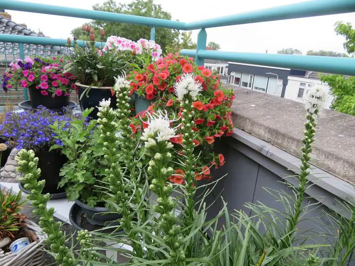 Ook bij deze Liatris bloeien de bloemen van boven naar beneden.