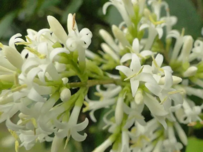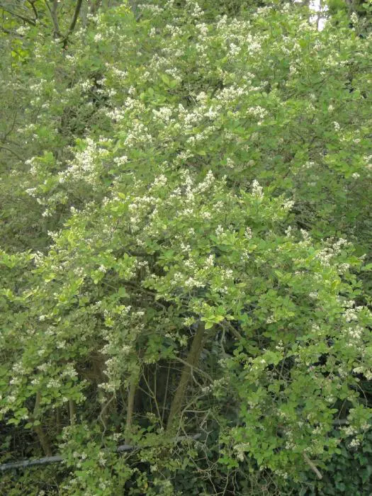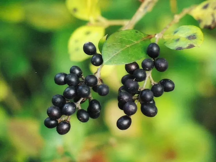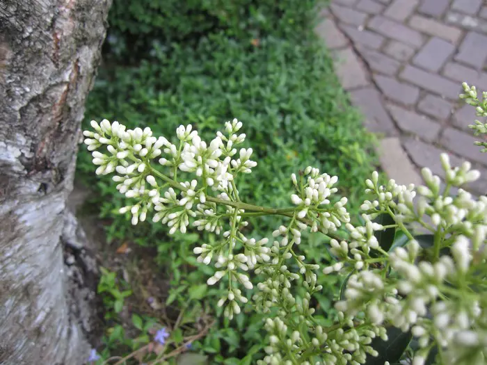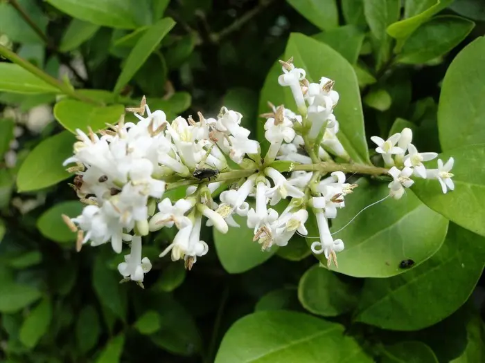 Ligustrum ovalifolium bloeit met geurende witte bloempjes gevolgd door zwarte bessen tenzij ze als haag gesnoeid worden dan blijft de bloei uit.
