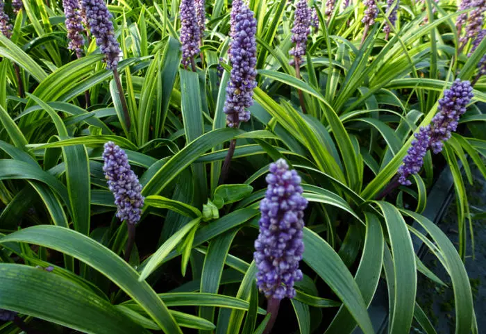 Liriope muscari 'Gold Band' vormt een pol van grasachtige, geel/groen bontgekleurde bladeren en bloeit met prachtige rechtopstaande violetpaarse aren.