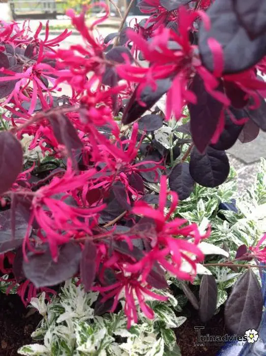 Loropetalum chinense 'Black Pearl' is een breed opgaand groeiende struik met afhangende rode bloei.