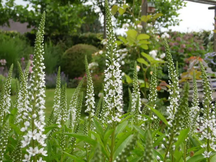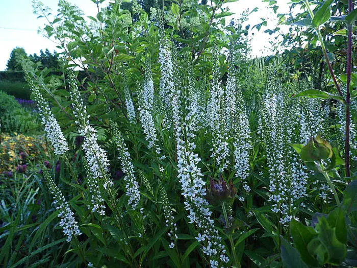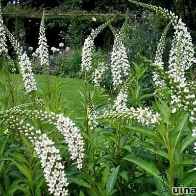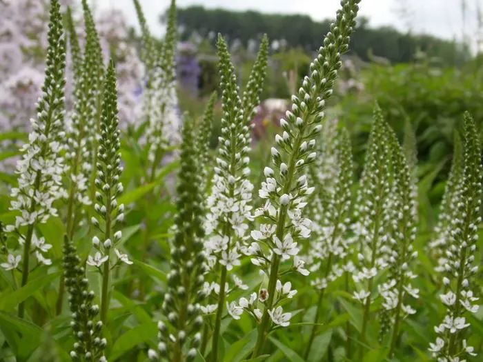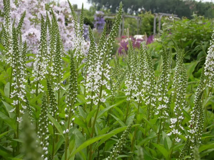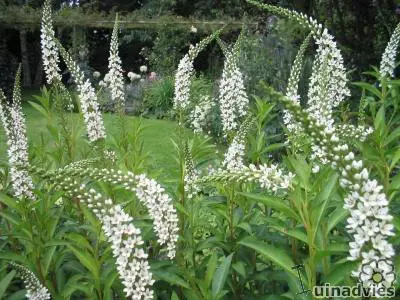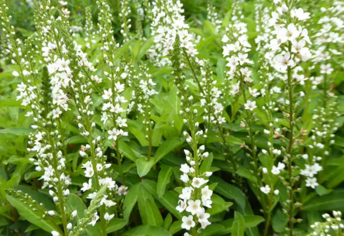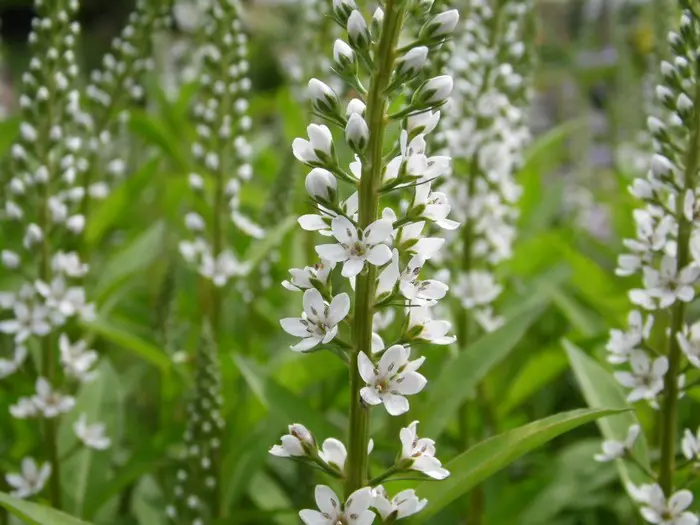 Lysimachia barystachys vormt rechte aren tot licht gebogen met kleine witte bloempjes.