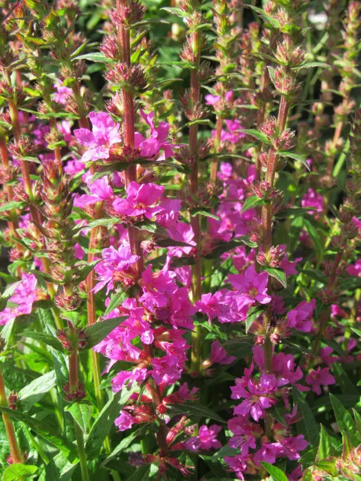 Lythrum salicaria 'Robin' bloeit op hoge stengels met paarsroze bloemen in schijnkransen.