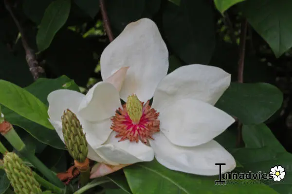 Magnolia 'Charles Coates' is een kleine boom (4m) of een hoge ronde struik met grote ovale bladeren.