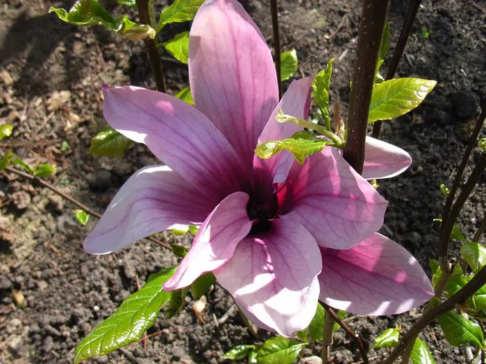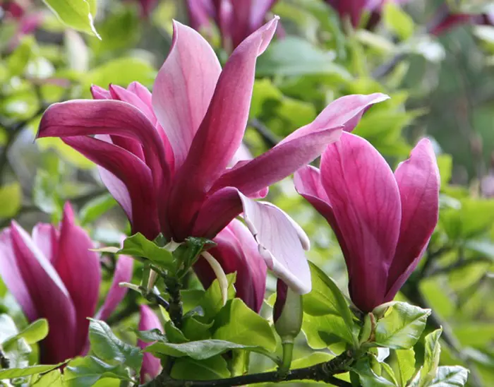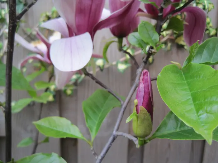Magnolia liliiflora 'Nigra' is een traag- en breedgroeiende, bossige meerstammige boom.