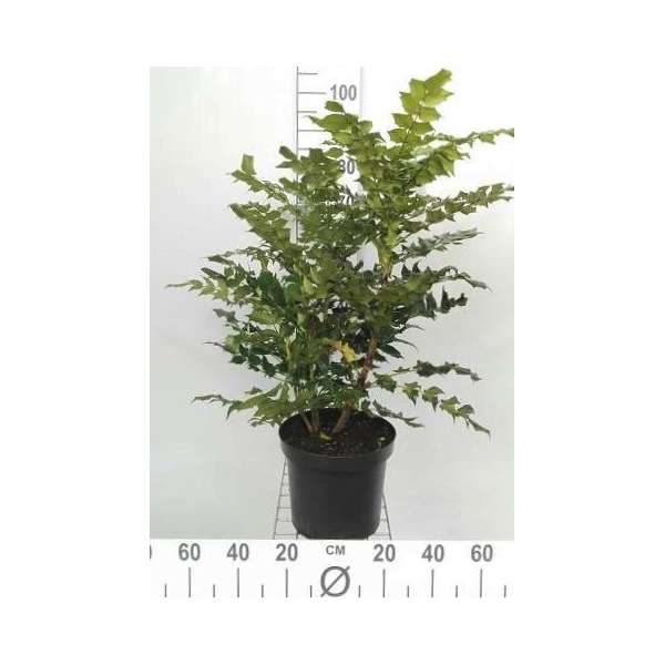 Mahonia japonica vormt een struik van glanzende donkergroene, geveerde bladeren waarvan de randen golvend en stekelig zijn. Verkleurend naar rood in het najaar.