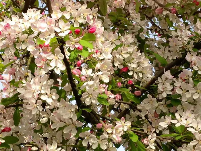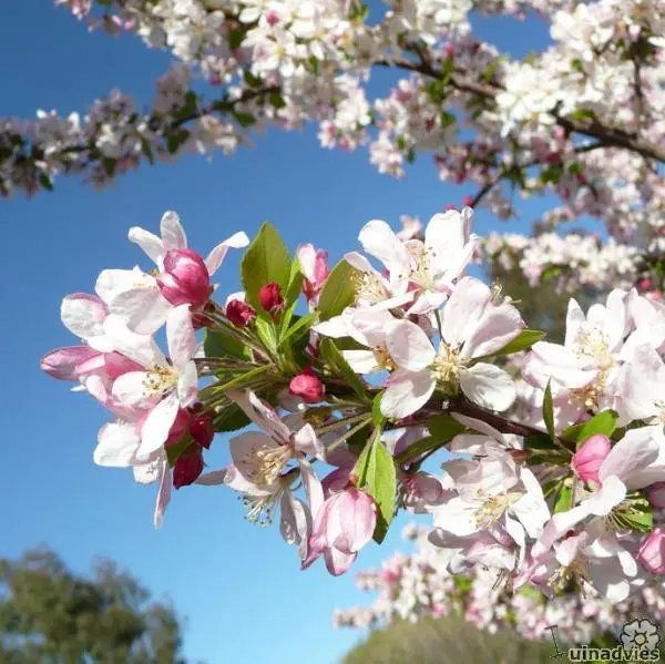Malus floribunda heeft een half open kroon en bloeit rijkelijk in de lente met roze bloempjes.