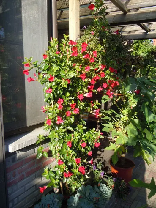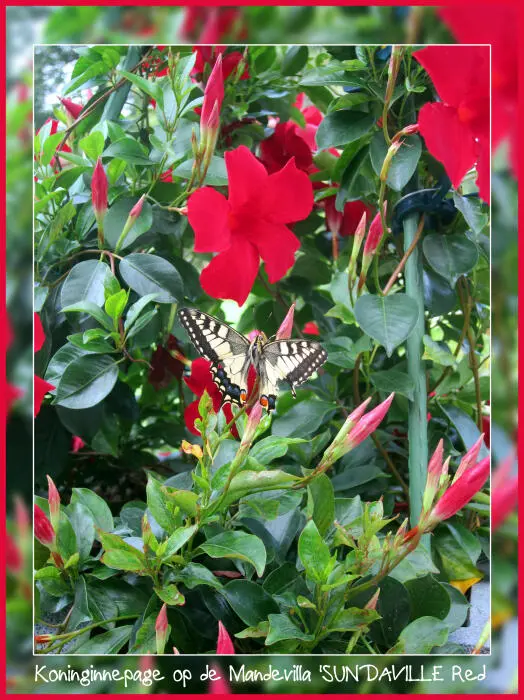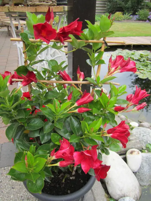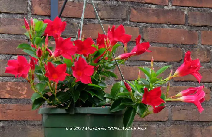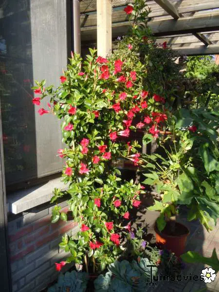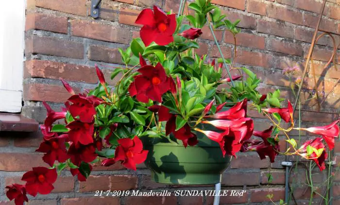 Mandevilla 'Sundaville Red' bloeit met rode bloemen en is niet winterhard, moet voor de vorst op een koele vorstvrije plaatst overwinteren bij tenminste 10°C.