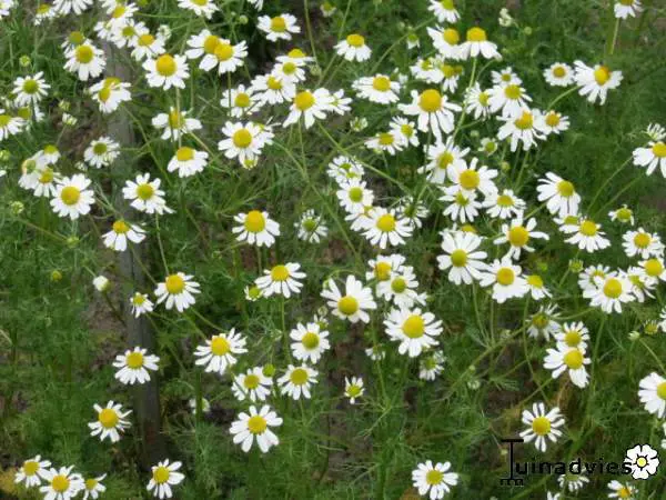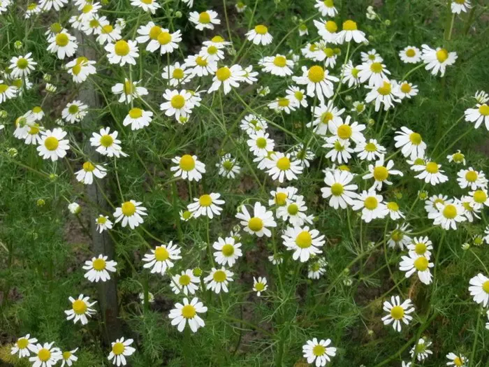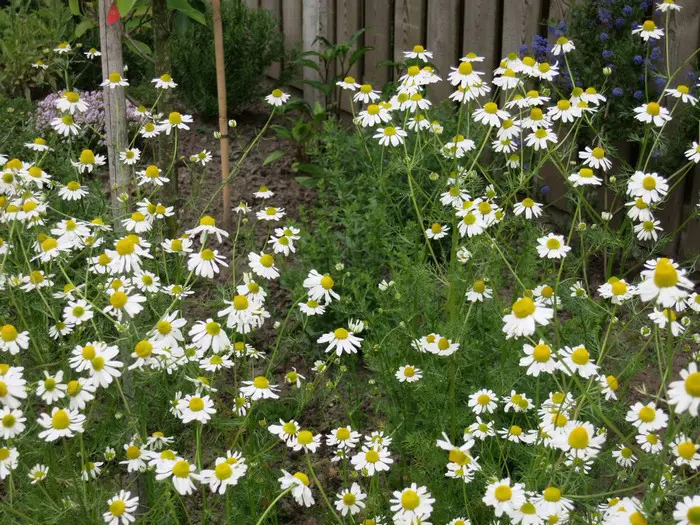 Kamille is een eenjarige plant vanaf juni tot en met september bloeit met witte bloempjes.