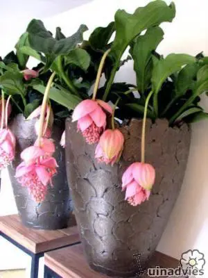 Deze kamerplant heeft immense bloempluimen waarvan elke toeschouwer onder de indruk is. De Medinilla's bloeien vanaf het voorjaar tot een flink eind in de zomer. Spijtig genoeg is het geen eenvoudige tante qua onderhoud en verzorging. Het is een fraaie woonplant van de Melastomataceae (familie) die afkomstig is uit de Filipijnen waar deze makkelijk anderhalve meter hoog wordt. Daar leven ze als epifyten = leven op andere planten zonder er voedsel van te onttrekken (zoals parasieten wel doen). Ze onttrekken het nodige vocht uit de lucht. Het is dan ook een kamerplant die de nodige verzorging, hoge luchtvochtigheid en warmte vraagt. De Medinilla gedijt best op warme plaatsen met een hoge luchtvochtigheid zoals een warme kas, serre, veranda,... maar kan tijdens de bloeiperiode wel voor enkele maanden naar de huiskamer verhuizen.