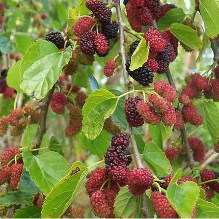De bloei is onopvallend maar de boom krijgt wel eetbare donkerrode tot zwarte framboosachtige vruchten.