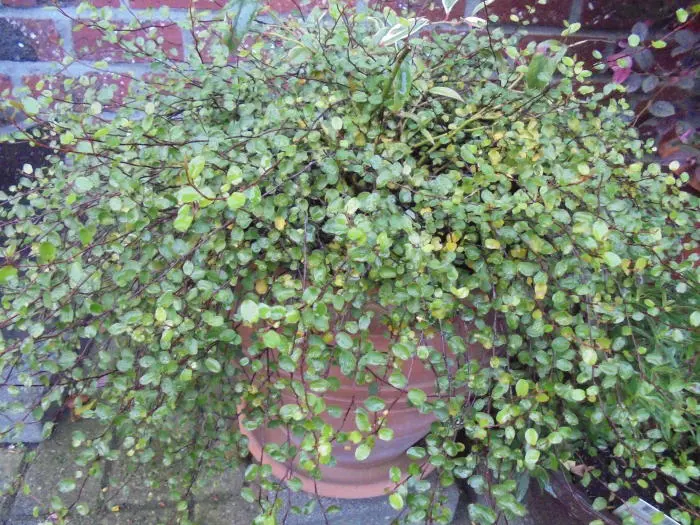 De bloei is te verwaarlozen, de sierwaarde van deze plant zijn de mooie kleine donkergroene blaadjes iets paars aan de rand.