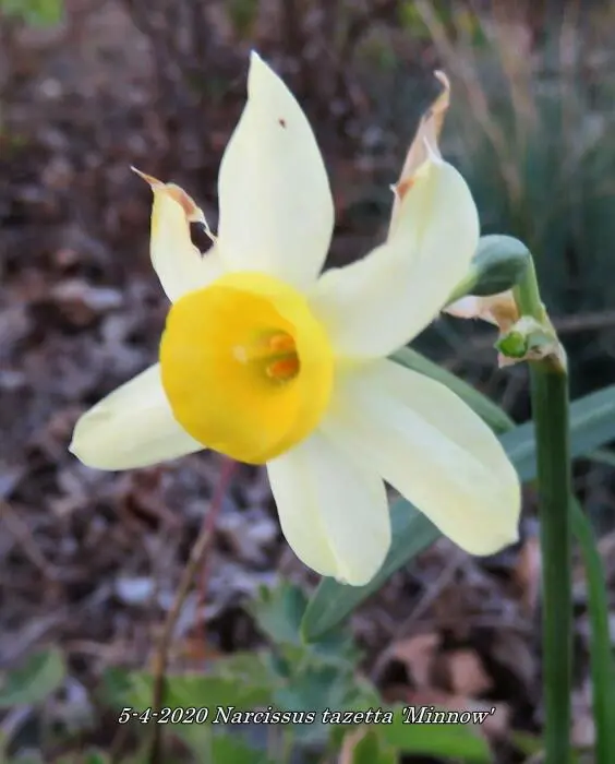 Narcissus tazetta 'Minnow' is een dwergnarcis en bloeit met meerdere bloemen op een steel. De geurige bloemen hebben witte bloemblaadjes met een lichtgele kroon.