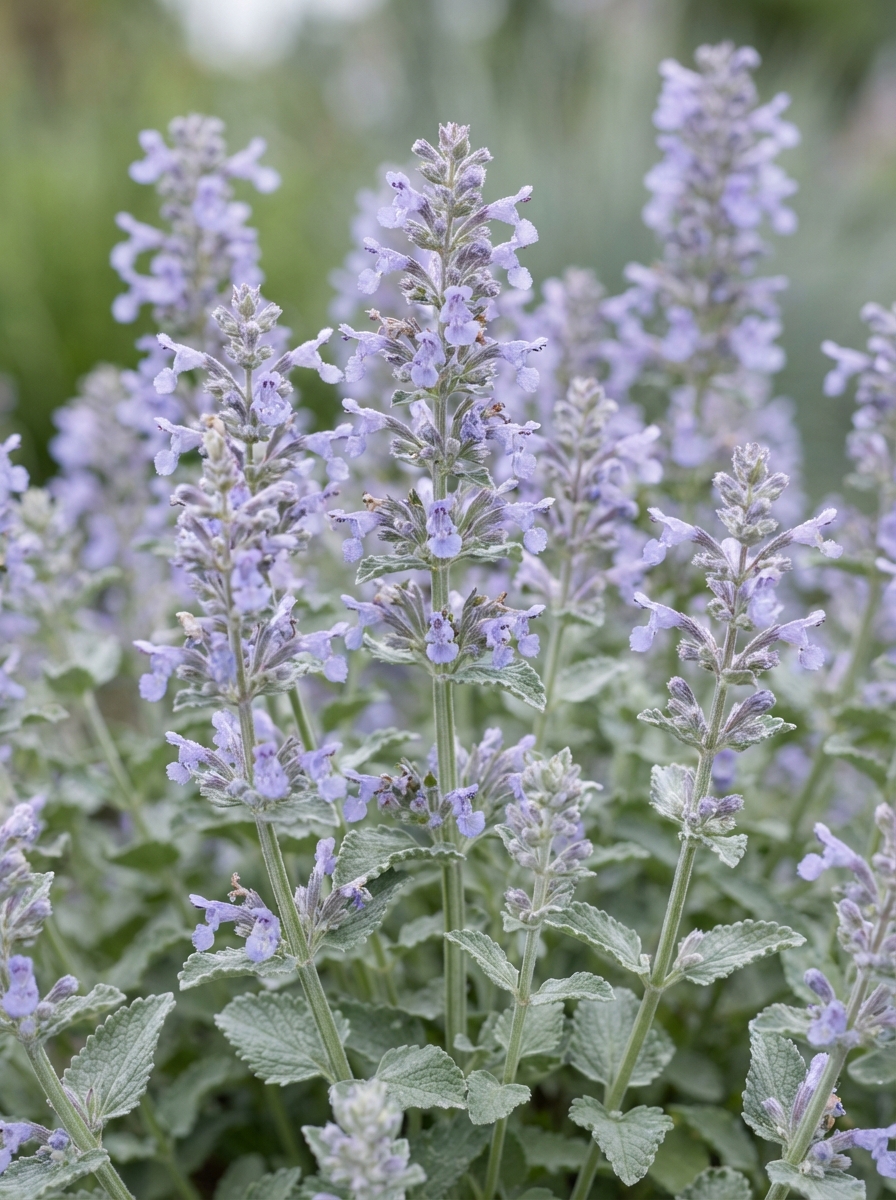 Nepeta x faassenii 'Gletschereis' bloeit met aren van zilverblauwe bloemen en heeft een klein grijsgroen blad.
