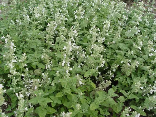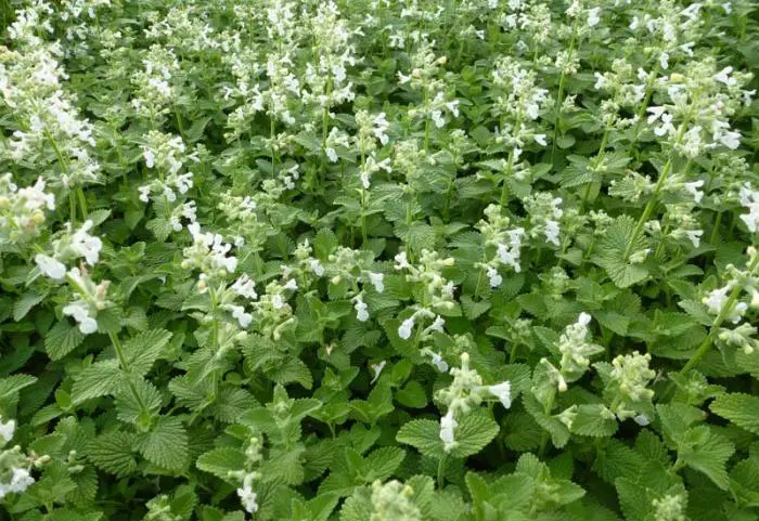 Nepeta racemosa 'Snowflake' is een bossige, zeer lage en vertakte plant, met kleine aromatische zilvergroene bladeren en rijkelijk bloeit met witte bloemen.