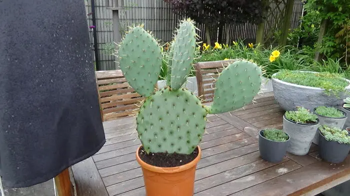 Opuntia engelmannii vormt een bossige cactus met blauwgroene schijven van ø 30cm en stekels van 2,5cm lang.