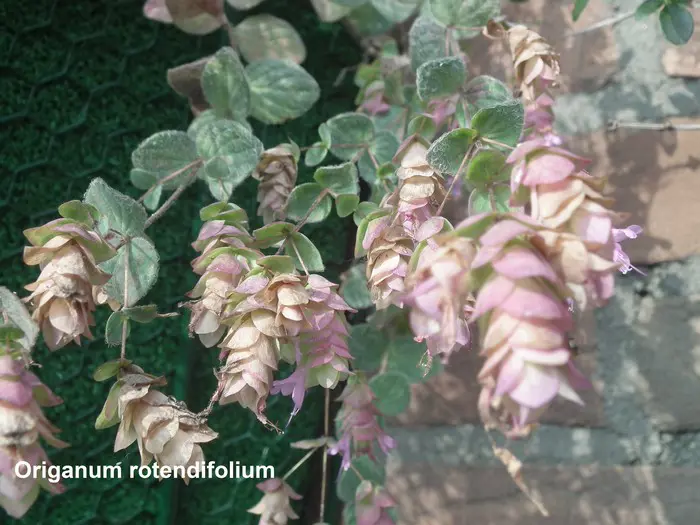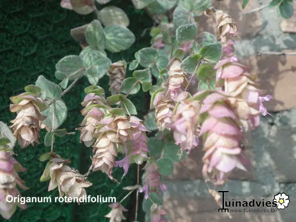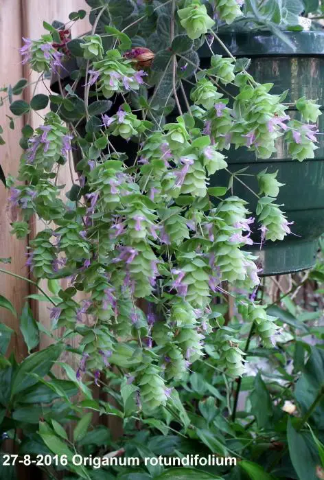 Produceert afhangende lange stengels van papierachtige lichtgroene schutbladeren met roze bloempjes.