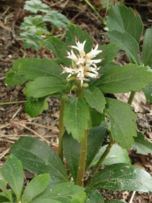Bloeit met witte bloempjes in april en mei maar zijn van weinig betekenis, het is vooral het blad dat opvalt.
