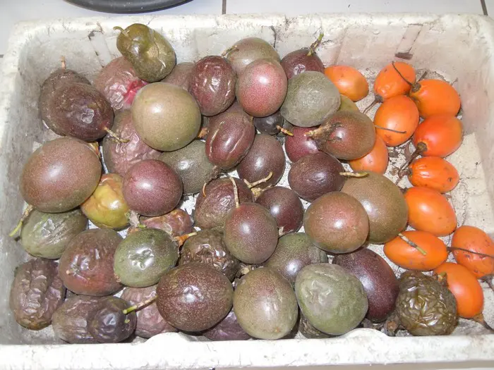 De purperen ronde vruchten zijn eetbaar met sappig geel vruchtvlees.