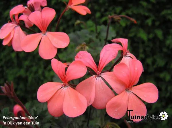 Pelargonium 'Alde' is en miniatuurvariëteit met enkelvoudige zalmroze bloemen.