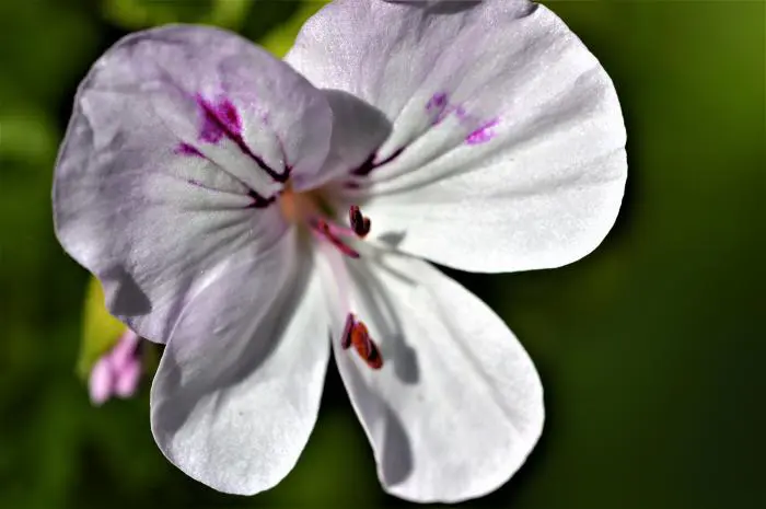 Pelargonium 'Moon Maiden' (angeltype) bloeit met enkelvoudige witte bloemen met violetblauwe vlekken.