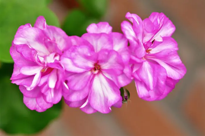 Pelargonium peltatum 'Harlequin Ted Day' is een hanggeranium met dubbele, violet/lichtroze/wit gestreepte bloemen.