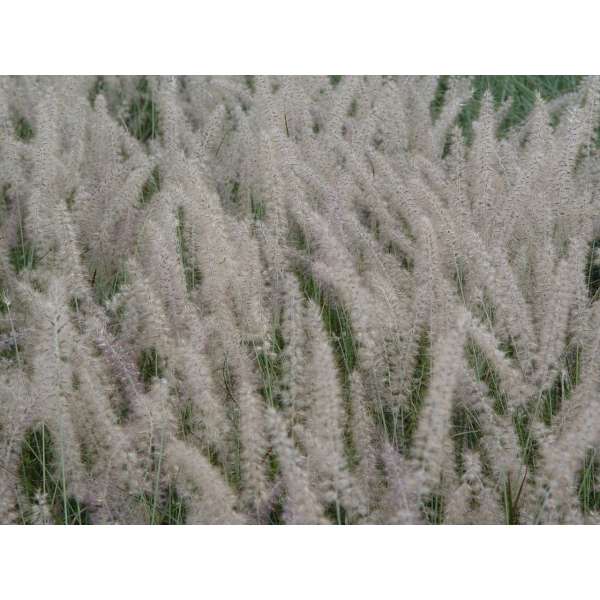 Het grasachtig blad van de Pennisetum orientale 'Small Tails' is glanzend grijsgroen.