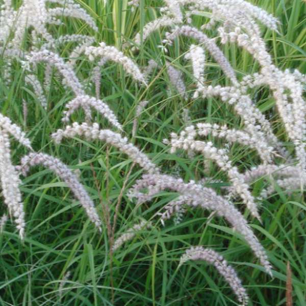 Pennisetum orientale'Tall Tails' is een overhangend compactgroeiend siergras met grijsgroene smalle lange bladeren en een overvloed aan zilverwitte pluimpjes.