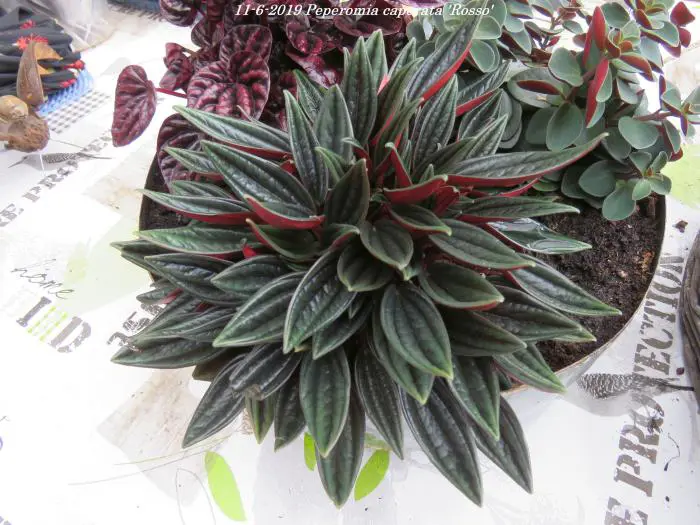 Peperomia caperata 'Rosso' is een half succulent en wordt hier als kamerplant gehouden.