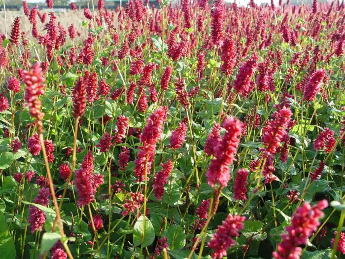 Persicaria amplexicaulis 'Lisan' bloeit met donker rozepaarse bloeiaren die vooral mooi uitkomt in grotere groepen.