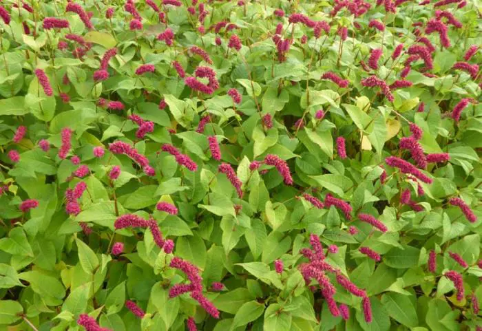 Deze duizendknoop bloeit met half knikkende karmijnrode aartjes.