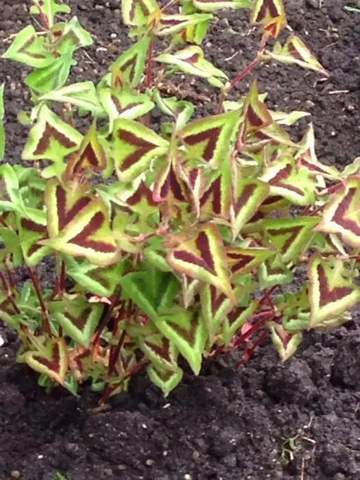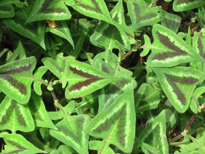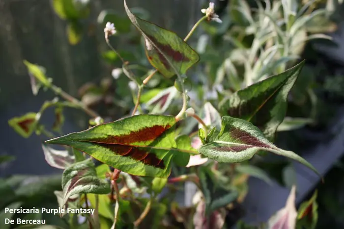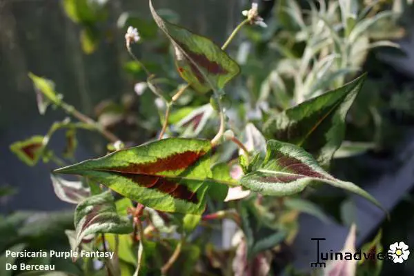 Persicaria microcephala 'Purple Fantasy' heeft aan dieprode stelen opvallende groene bladeren met een driehoekige purper- en zilverkleurige V-tekening in het midden. In het najaar kleurt het groen naar een paarse tint.