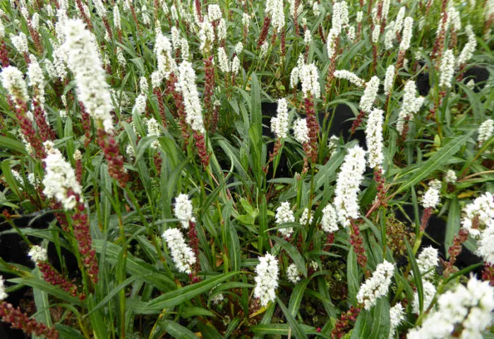 Persicaria vivipara bloeit met roze tot bijna witte bloemaartjes.