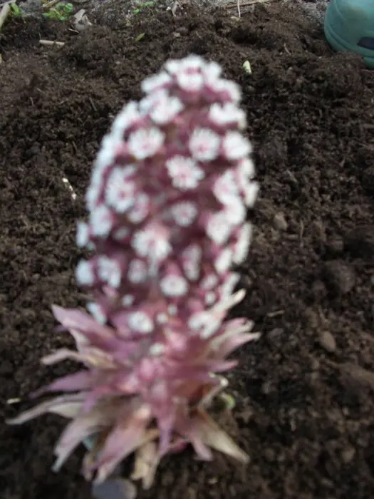 Voor het verschijnen van het blad bloeit de plant met rechtopstaande knotsvormige lichtroze bloemen