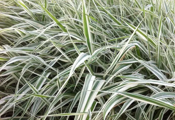 Het blad is roomwit/groen gestreept. In de zomer verschijnen de smalle luchtige pluimen verkleurend van lichtgroen naar bruinpaars.