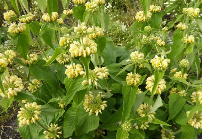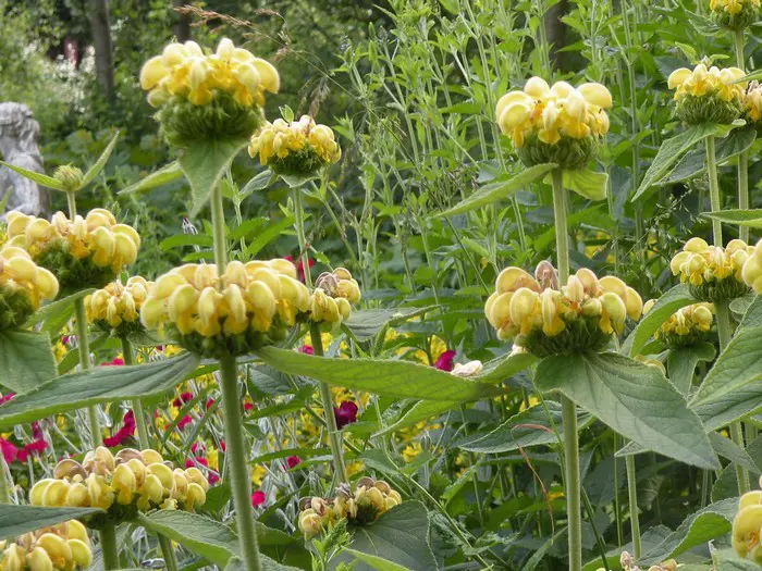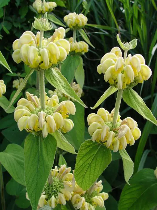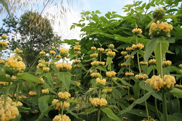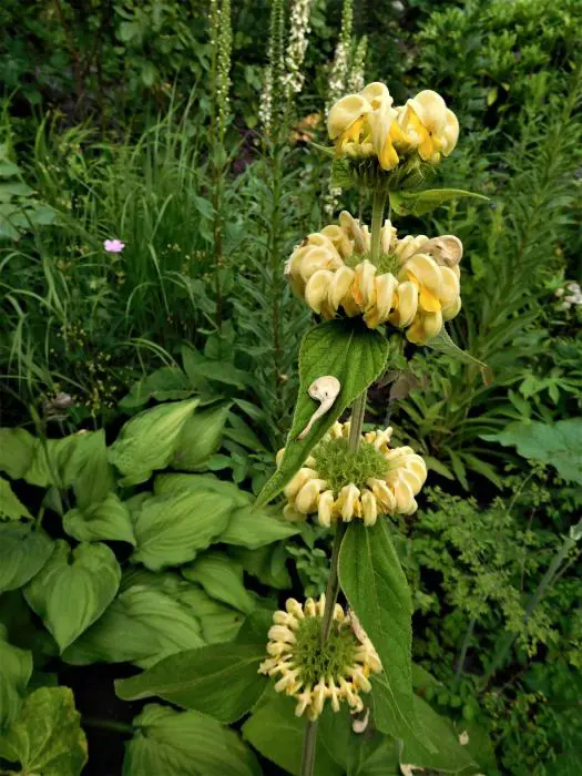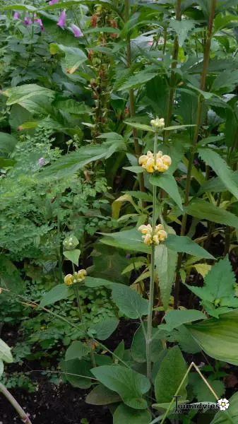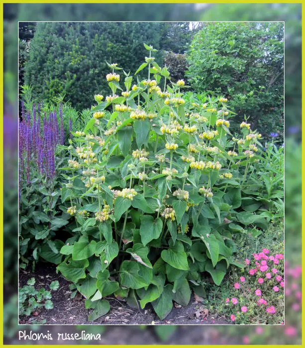 Phlomis russeliana is een mooie bodembedekkende vaste plant die rechtopstaande bloemenstelen vormt in bleekgele kransen.