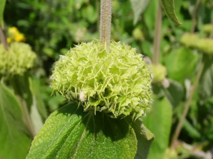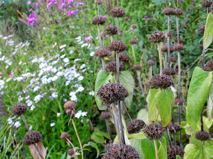Nà de bloei blijven de groene 'kussentjes' aan de stengel over en zo blijft de plant tot eind september nog altijd interessant voor in de border.