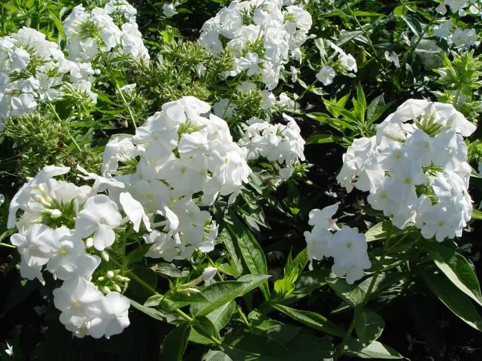 Phlox paniculata 'David' bloeit met witte pluimvormige bloemen.
