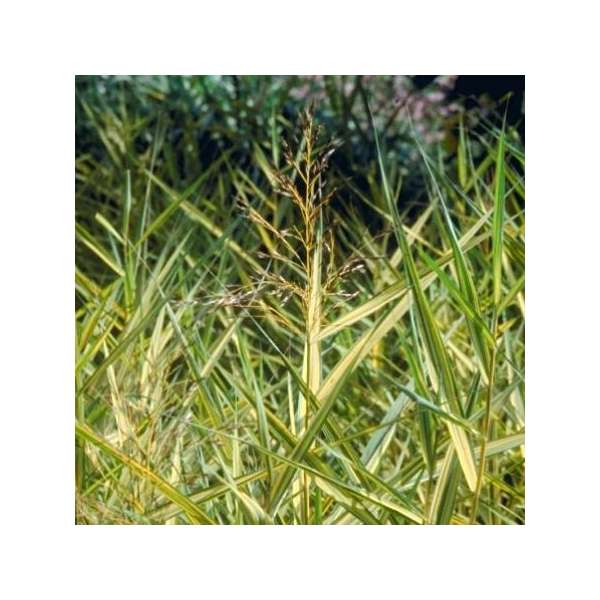 Heeft brede geelbonte knikkende bladeren en bloeit in de zomer met bruinrode tot bruinpaarse bloempluimen.