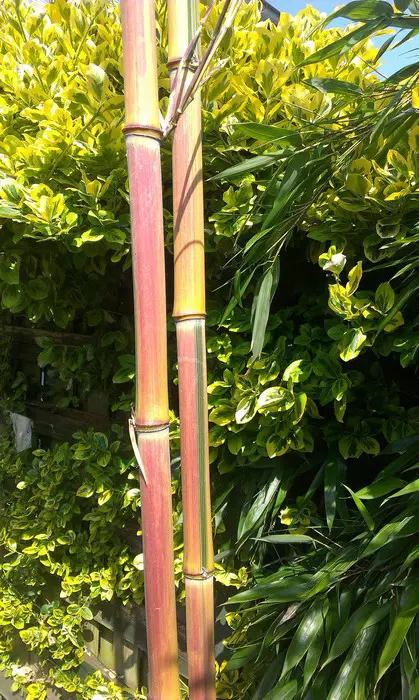 Phyllostachys aureosulcata 'Spectabilis' heeft gele tot roodachtige stengels. Hoe meer zon hoe roder.