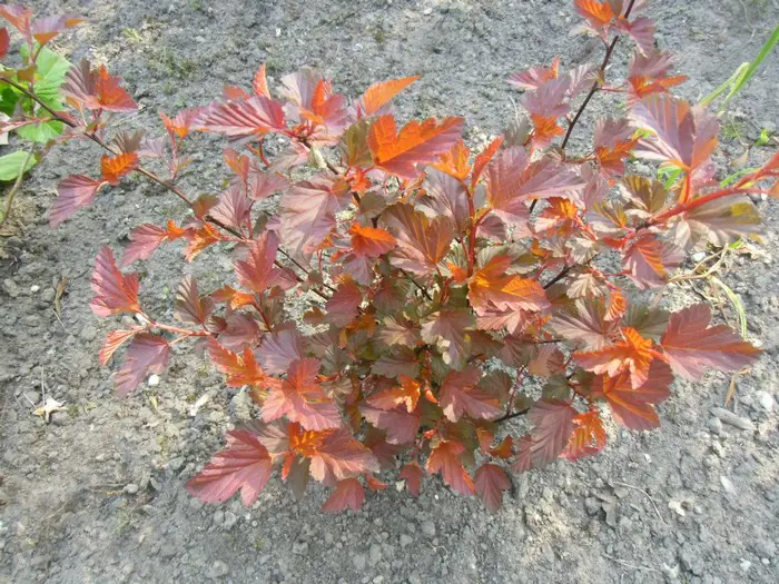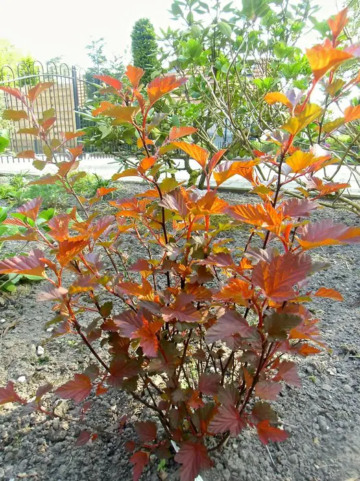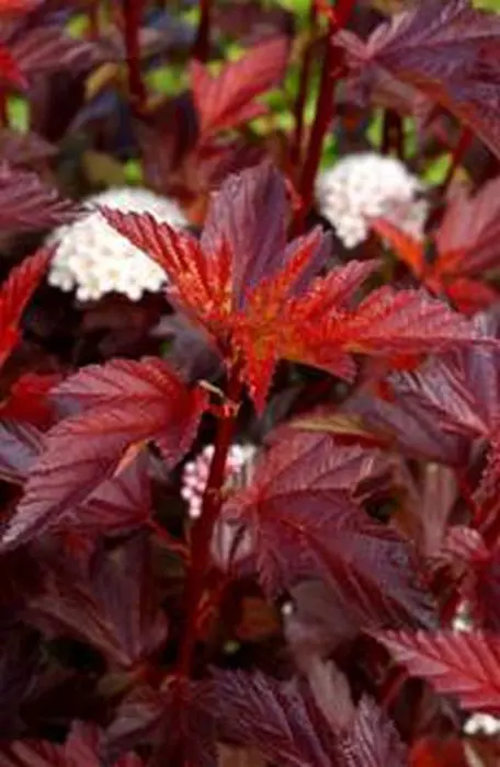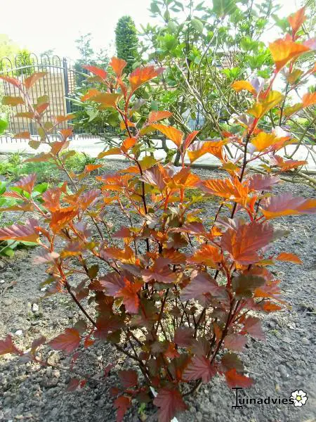 Physocarpus opulifolius 'Diable d'Or' is een compacte heester met een opgaande en spreidende groeiwijze en gelobde, prachtige bronskleurige bladeren in de lente die in de zomer tot roodpaars evolueren.