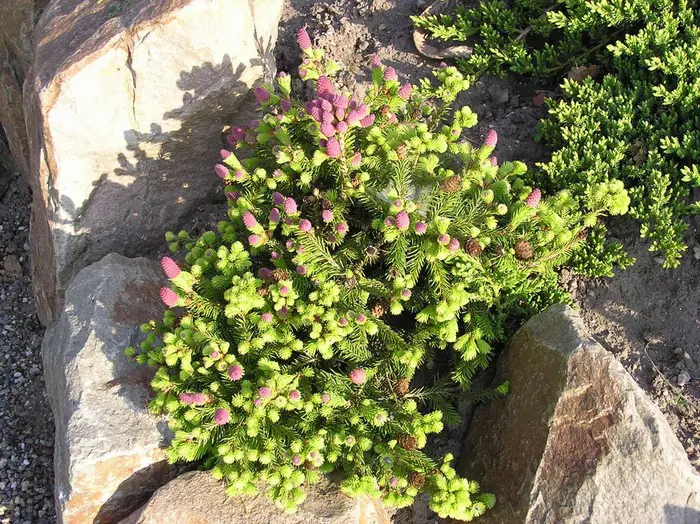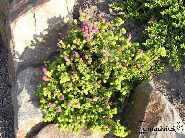 Picea abies 'Pusch' is een onregelmatig groeiende dwergconifeer met een afgeplatte ronde vorm. Erg opvallend en decoratief zijn de jonge gele naalden samen met de paarsrode kegels aan de takuiteinden.