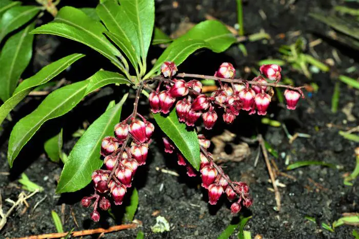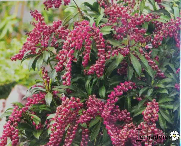 Pieris japonica 'Passion' is een heester met in de lente, prachtige hangende trossen van donkerroze (bijna rood) urnachtige bloemen, zoetgeurend naar honing.