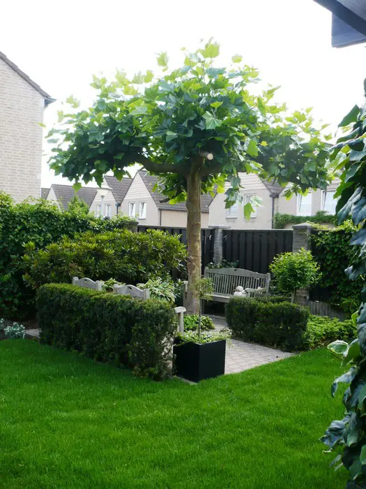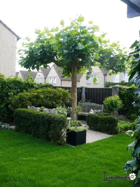 Platanus x acerifolia 'Alphens Globe' heeft een onopvallende roodbruine bloei.