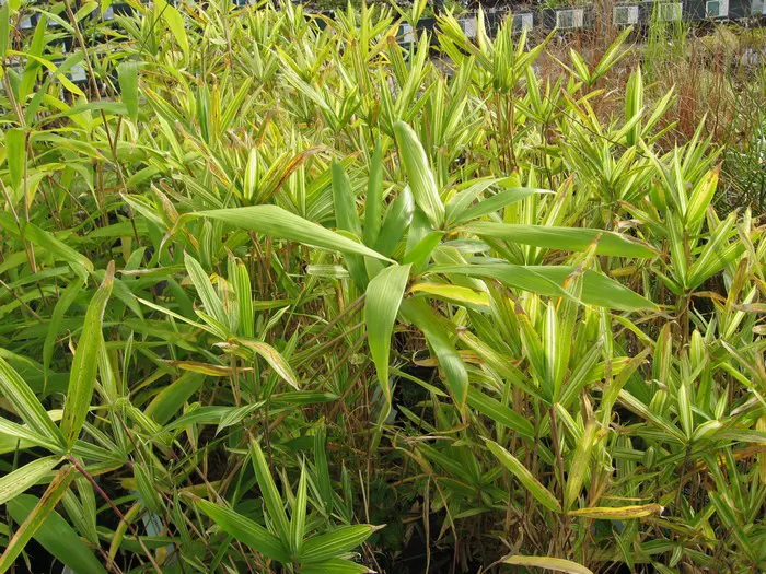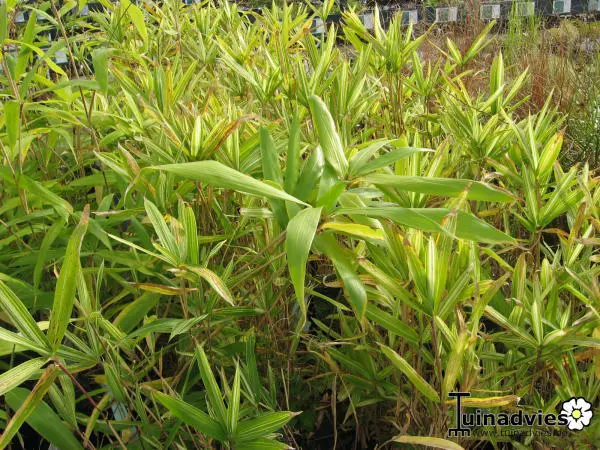 Pleioblastus fortunei vormt een dichte pol van witbonte bladeren.