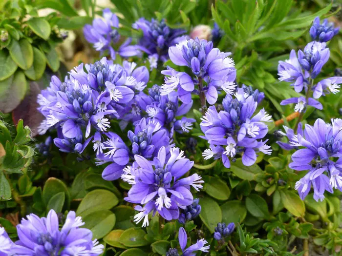 Het is een compacte, bodembedekkende plant met kleine leerachtige groene blaadjes en korte trosjes van helderblauwe bloempjes met witte tippen.