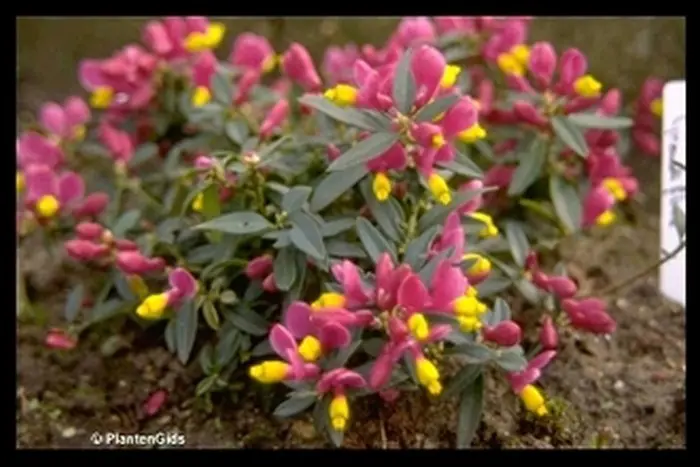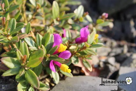 In de lente bloeien kleine tweekleurige paarsroze/gele bloemen.
