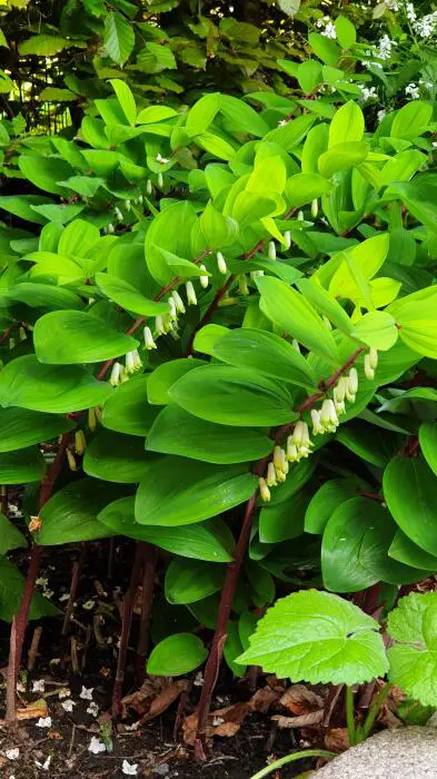 Polygonatum odoratum 'Red Stem' is een geurende salomonszegel met roomwitte buisvormige bloemen aan lang gebogen wijnrode stengels.
