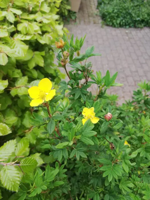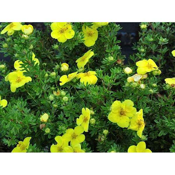 Potentilla fruticosa 'Kobold' is een zeer dichte variëteit met een rijke bloei van komvormige goudgele bloemen die enigszins verbleken in de felle zon.