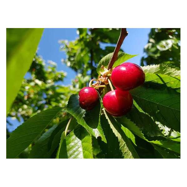 Prunus avium 'Regina' heeft donkerrode/zwarte vruchten met stevig en zoet vruchtvlees.