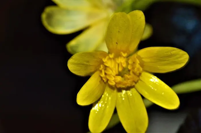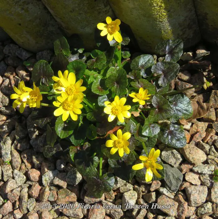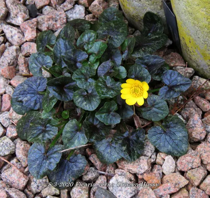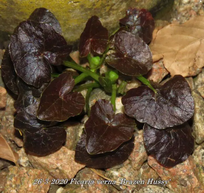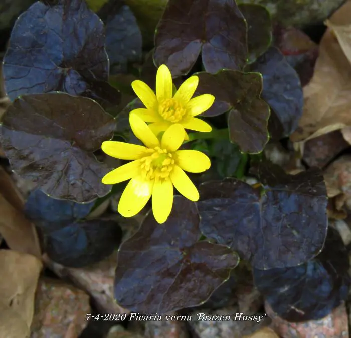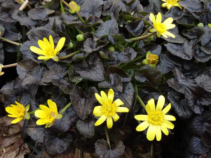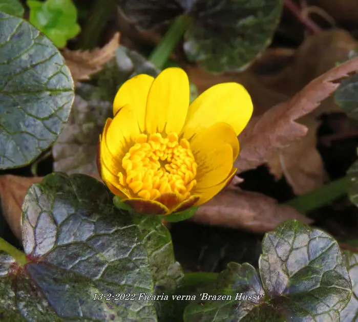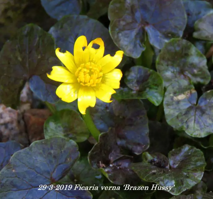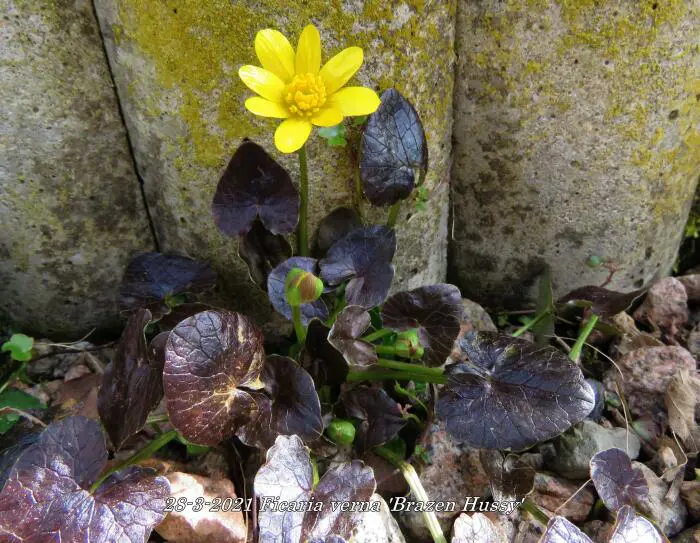 Ranunculus ficaria 'Brazen Hussy' bloeit met glanzende gele bloempjes maar het blad van dit speenkruid is zwartachtig brons van kleur .